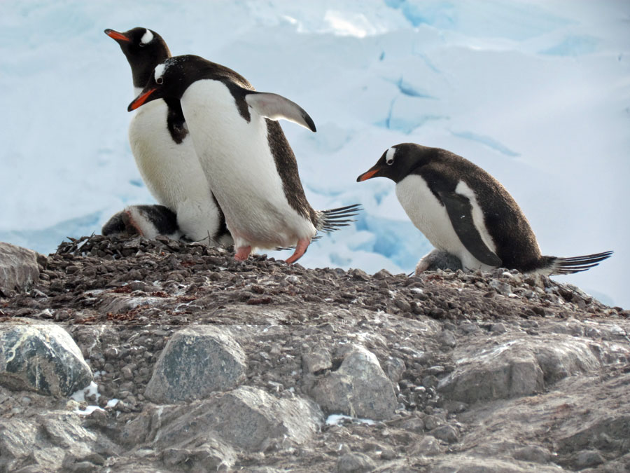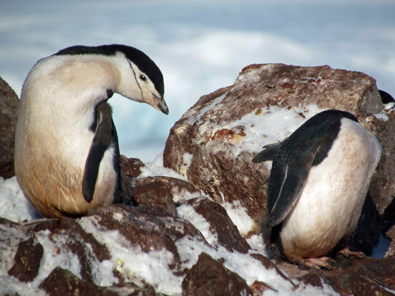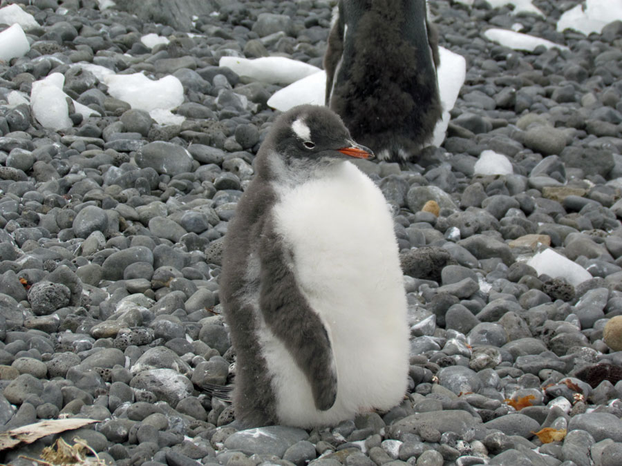 The last day of February was also our last on the peninsula. We arose at 6:30 to a temperature of 25°. With light snow falling, we took a zodiac cruise around Ciera Cove. We kept clear of the icebergs, some of them fantastically shaped. After lunch we made a final landing on Mikkelsen Island. Many Gentoos, including chicks, and seals. Skuas had landed, but were not visibly on the attack.