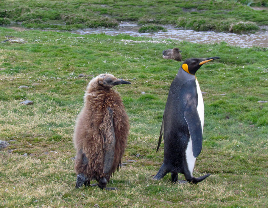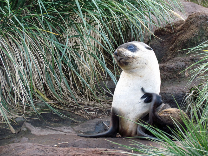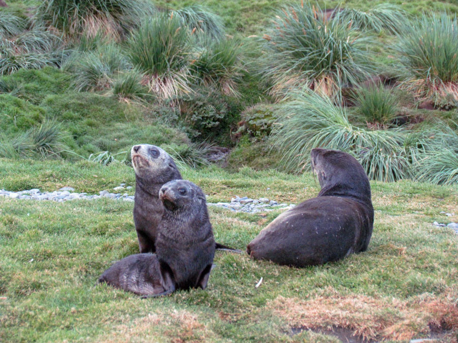 A couple more days sailing, with some movement on the ship, brought us to South Georgia. We had begun to see icebergs, some wildly contorted, some flat (tabular). These can be more then 25 miles long. On the map South Georgia resembles a big banana. On the ground it is a fearsome black-and-white montage of glaciers and sharp peaks. We made many stops along its north coast. We saw birds (gulls, skuas, albatross etc.), many varieties of seal and thousands more penguins. The skuas prey on penguin chicks. The seals and penguins get along nicely. They are quite approachable, but we were told to keep a reasonable distance so as not to disturb them.