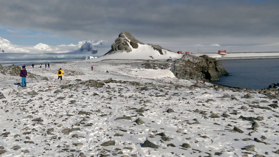 The weather next morning was gorgeous: uncharacteristic blue sky, and temperatures well above freezing. We landed near Half Moon Bay. Brilliant snow mountains and glaciers. Also penguins and seals. In the afternoon the captain carefully brought us to Deception Island , a remarkable place. It is a collapsed volcanic cone, with a gap (“Neptune’s Bellows”) where the ocean penetrates. It’s rather like Oregon’s Crater Lake, but with sea water. Lonely Planet calls it “one of the safest natural harbors in the world, despite periodic eruptions.” Such eruptions occur about every 40 years. The last was in 1971, Do the arithmetic... We landed anyway and hiked up to Neptune’s Gate, which gives a precarious rocky view of the ocean. A few of the more hardy or reckless passengers took a brief dip in the icy waters. We did not. I won’t say whether we saw any more penguins.
