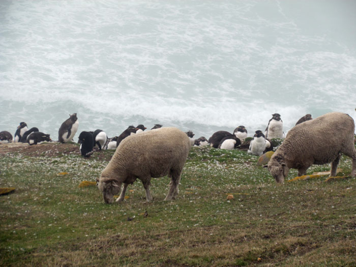 First stop was the alarmingly-named Carcass Island. It was in fact a pleasant place, even warm (50°). We saw our first of many thousands of penguins. There are 17 types, of which we encountered seven. I had best not go into all this. The couple who own the island provided pastries and coffee. In the afternoon we visited another island, Saunders. Sheep mingled with lots more penguins: Gentoos, Magellinics in and out of their burrows, Rock Hoppers and Kings (biggest of all except the Emperors, which we did not sail far enough south to see).