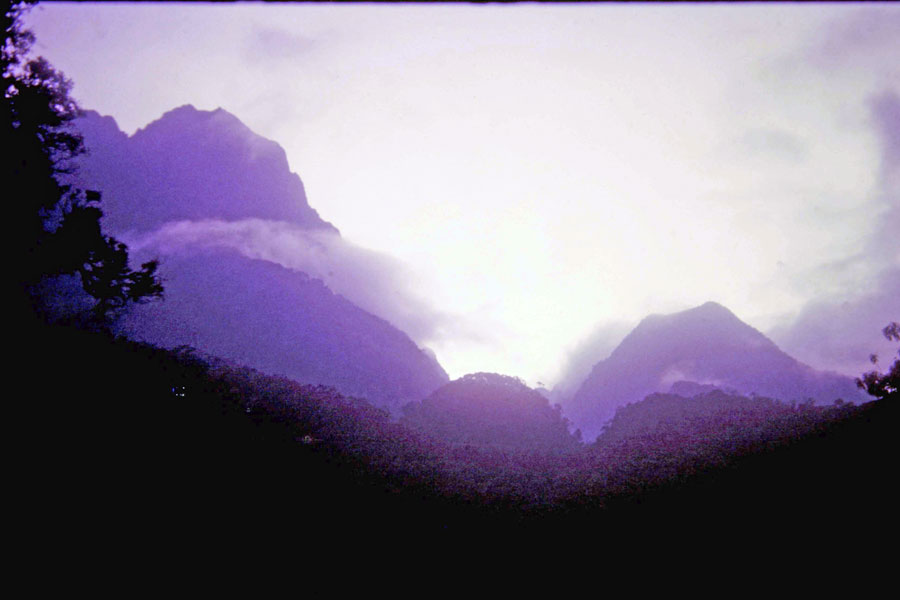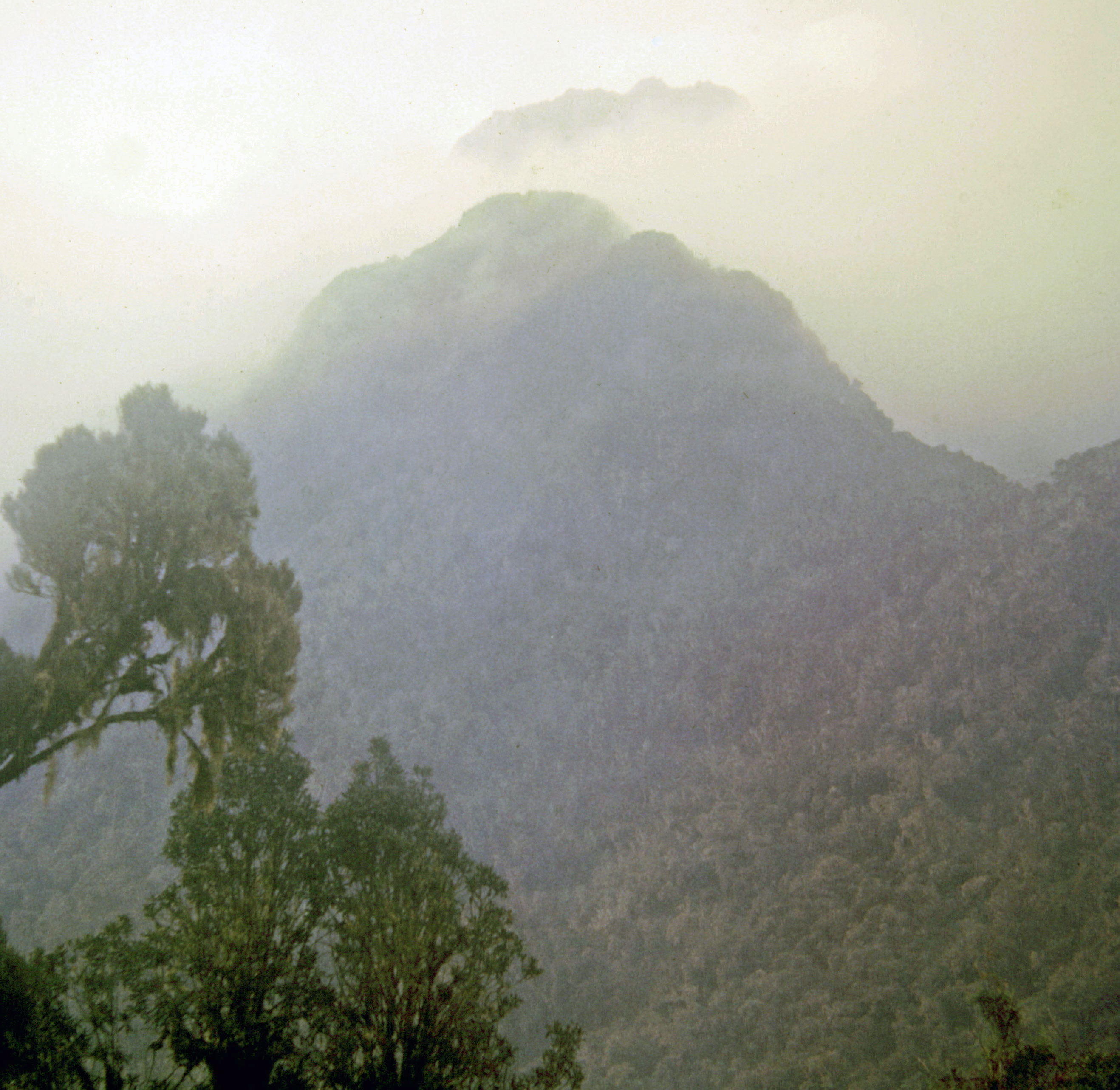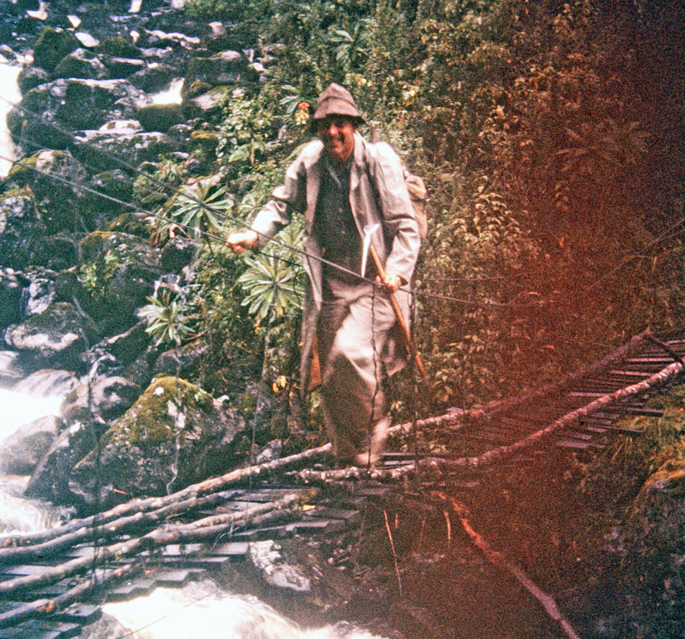 | Bob Bates crossing a bridge at the start of our approach to the Ruwenzori | ![]() |