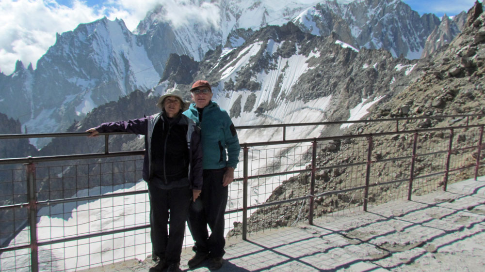 One of the téléphériques that still run in September is the most famous: to the Aiguille du Midi. It is spectacular and very popular, but to be avoided if you dislike heights. In two stages it lifts you more than 9000 feet. At one point it seems certain to crash into the rocks, but it won’t. You arrive at nearly 12,7000 feet. (In summer, you can continue over a shoulder of Mont Blanc and end up in Italy.) Bring your woollies. Hard snow glazed the wooden decks when we were there. There are of course a gift shop and restaurant. The 360-degree panorama is amazing. If you really want, you can visit the topmost tower, alarmingly called Le Pas dans le Vide.