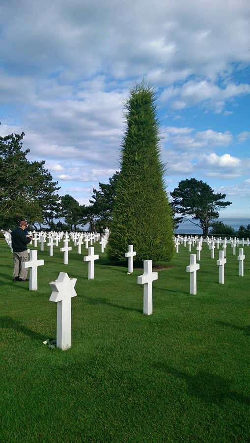 , backed by gentle vegetated slopes. Narrower Omaha leads to forbidding bluffs that provided the Germans deadly lines of fire. Thus casualties at Omaha were by far the higher of the two beaches. The nearby cemetery with thousands of crosses and a few Jewish stars testifies to the carnage. The beaches are quiet now and General Rommel’s ingenious murderous obstacles are gone, but still visible are the remains of German bunkers, where many defenders fired and died.