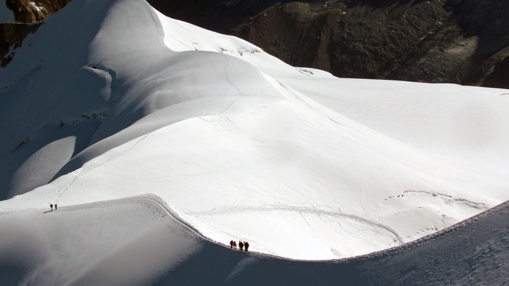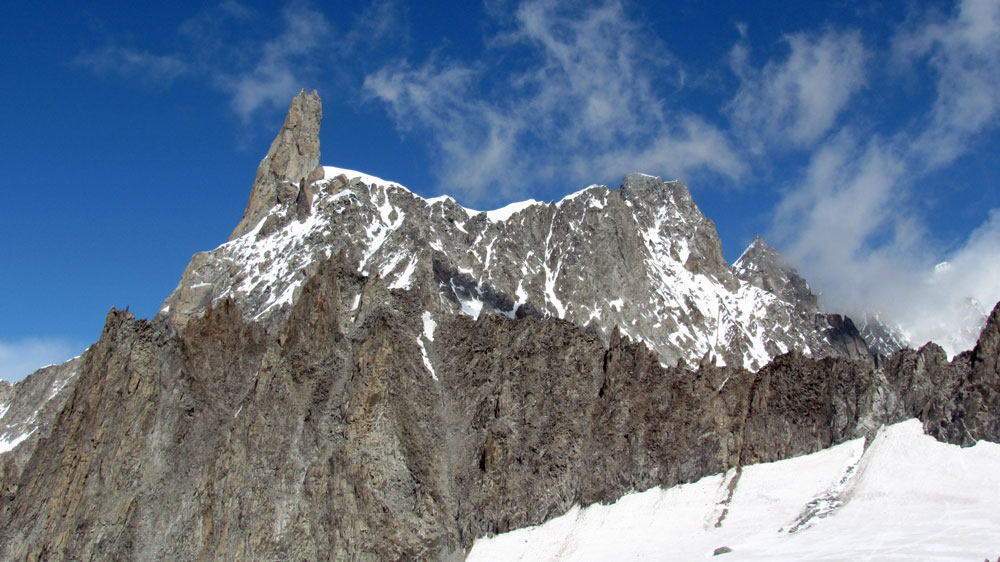 We emerged from the tunnel in another country, Italy, without any border check. We were now in Courmayeur, a quieter Chamonix. On this side, Mont Blanc is anything but the innocuous snow blob that you see from France. Instead there is the fearsome, rock-divided Brenva Face--read T. Graham Brown’s classic account in Brenva (1944). Even harder routes have been made on either side of the face. We had a great view of all this by taking a cable car to the Pavillon de Mont Fréty, ca. 7200 feet.