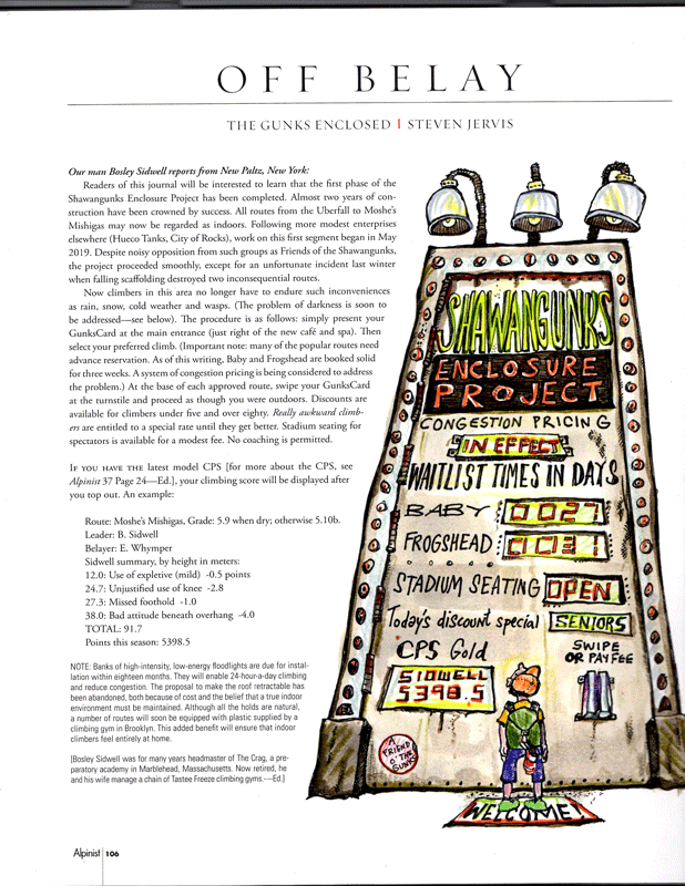 Readers of this journal will be interested to learn that the first phase of the Shawangunks Enclosure Project has been completed. All routes from the Uberfall to Moshe’s Mistake may now be regarded as indoors. Almost two years of construction have been crowned by success. Following more modest enterprises elsewhere (Hueco Tanks, City of Rocks), work on this first segment was begun in May 2019. Despite noisy opposition from such groups as Friends of the Shawangunks the project has proceeded smoothly, except for an unfortunate incident last winter when falling scaffolding destroyed two inconsequential routes.