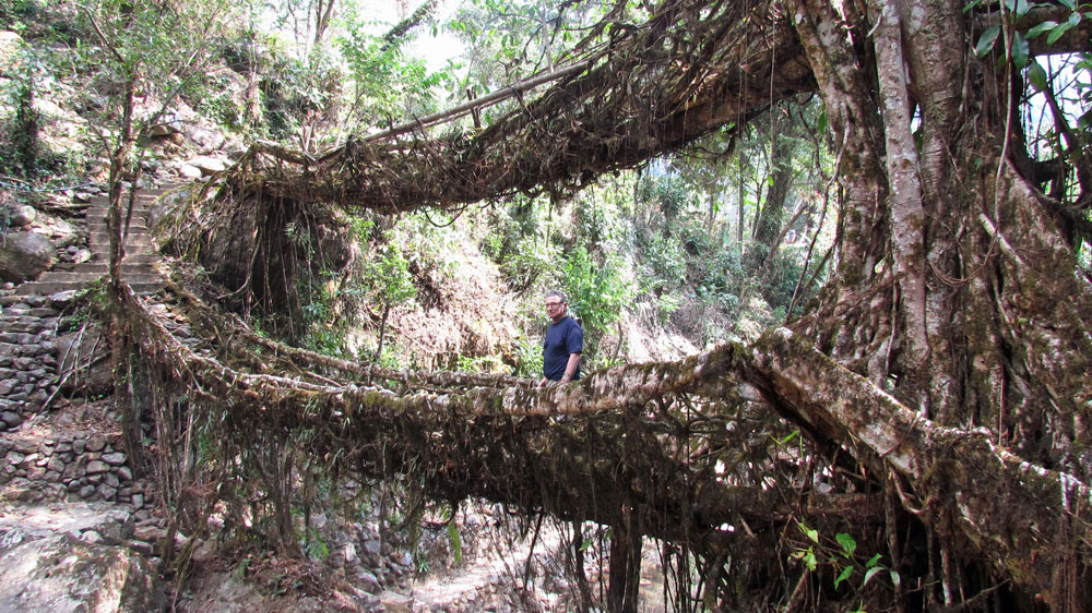 Major sights include the “living bridges,” composed of the roots of rubber trees that have been stretched across the river. Seeing these organic mechanisms requires a long descent into the valley. We tried this with the equivocal aid of the Resort sketch map. We descended stone stairs for 1000 feet or so, into the forest. When the steps became indistinct, we retreated, uphill. The next day we had a 19-year-old boy to guide us. The steps were clear all the way down, but there were 1900 of them. What goes down, must rise up, I reflected grimly. We crossed the bridges, including the famous double decker. One span is about fifteen feet above the other. Living bridges, unlike the usual kind, can withstand the monsoon spate.