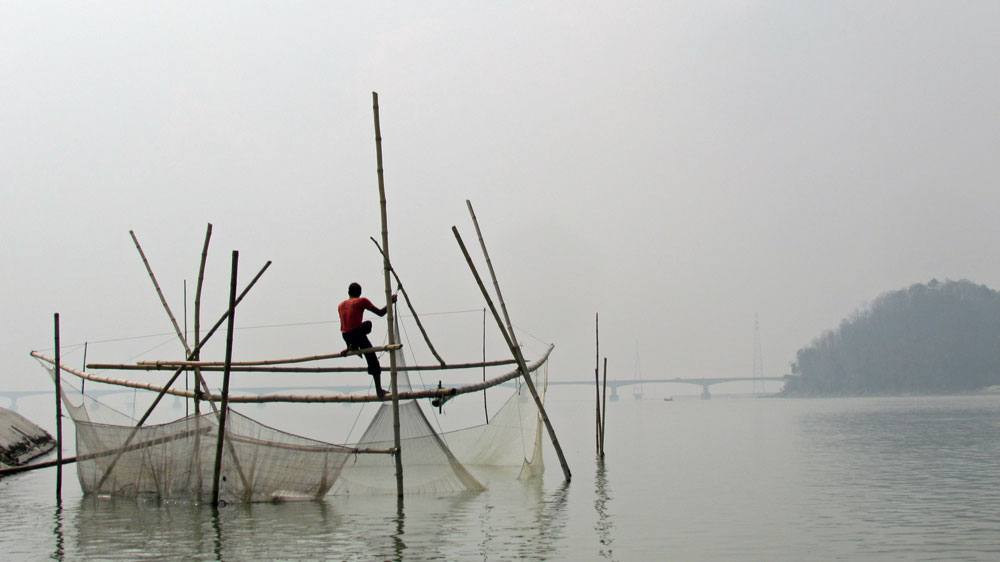 After six hours we arrived at the Golden Tips Bungalow, at the Wild Mahseer tea plantation. We had access to the Nameri National Park. The next morning we took a guided walk by the river, where we saw four hornbills and two tame elephants (and some wild ones). The following day we had a raft trip on the Bhramaputra to look at the dolphins. Like all Indian rivers, it was at low water. Come the monsoon, all would change with flooding eating away farm land. It is one of the country’s two great rivers, the Ganges being the other.