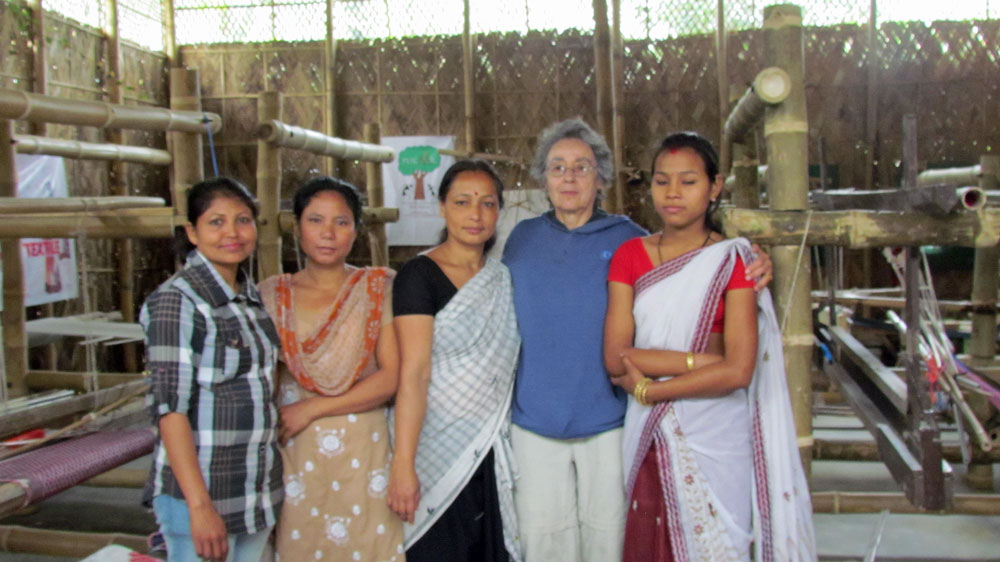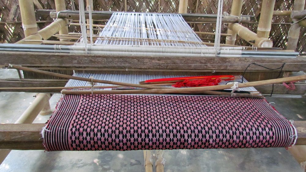Our guide at the tea plantation said he would take us to meet a local weaver, in Tezpur. This was considered nearby but, given roads, traffic, cows it was still more than an hour away. Turned out we were visiting his sister-in-law and niece! The niece has a business weaving, designing and running a small workshop in the family garage. (She was the only weaver we met who was not running a non-profit.) She has five or six weavers, all women, working for her. None of them were there when we visited. She uses the various kinds of Assamese silk (Assam is famous for its silk) but does not do her own spinning. There is a large military base in Tezpur so she has plenty of business. She does not need to worry about local tastes as her customers are from all over India. Susan bought a white scarf woven in Eri or Endi silk, which is the product of domesticated silk worms and produced, Susan believes, only in Assam. It is thicker and rougher than other silks.