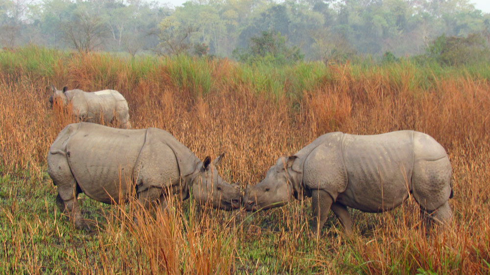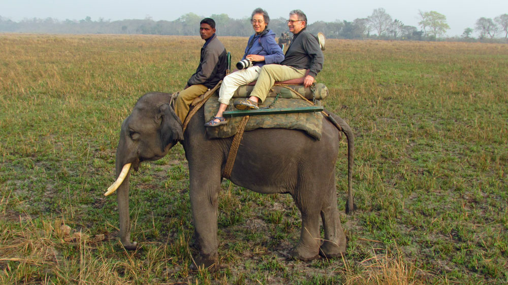 The Park is famed for the otherwise rare one-horned rhino. You are promised a sighting. In fact, you will have many; their population is around 2000, and they roam placidly within easy view. The best way to see them is atop an elephant, as we discovered early the next morning. The elephants follows instructions and can approach within twenty feet of the rhinos, which pay them no attention. Poaching remains a problem in the area, and the Park rangers take it with deadly seriousness. While we were there, they shot dead two poachers who had just killed a rhino. We drove with a ranger on his way to collecting the bodies.
