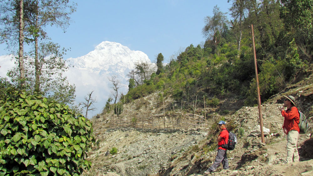 Comfort was reduced the next morning. After a half hour’s drive to the village of Phedi, the easy trek began. But as I perfectly well knew, Nepal has short treks and long treks, wet treks and dry treks. It does not have easy treks, especially if you are 76 years old. We started up a long, steep flight of stones. Besides the five of us, there were our leader, Pasang Sherpa and his assistant Gopal, plus two porters, each carrying about 65 pounds. We each had day packs, with water, camera, parka and such. For the next seven days, there was little level ground. Many of the trails were stone steps--many. The weather was a little cool for the season (mid-March). The (south) Annapurna Base Camp, just a few days past where we went, was reportedly deep in snow. Because the rains had not begun, we were spared the customary plague of leeches. (We regretted not introducing our friends to this experience.) The trails were clean by Nepali standards. Recycling was encouraged. In one area, plastic bottles were forbidden.