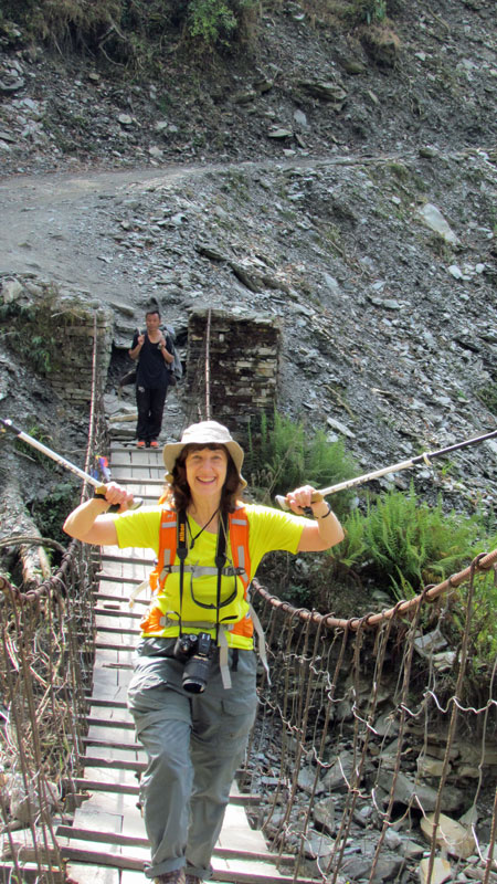 We spent each night in a trekking lodge. They were luxurious compared with the ones I recalled from Langtang in 1992: private rooms with twin beds, thin mattresses and sometimes blankets. (Our sleeping bags were part of the porters’ loads.) There were common showers and toilets that actually flushed. (Reminder: always carry your own toilet paper.) Wi-fi was usually available. We were usually on the trail by 8:00, heading up or down steeply. No later than noon we had lunch (one hour) at a tea house. Then more up and down before reaching our lodging mid-afternoon. Susan wants me to mention the hot showers that she and Vivian took at one lodge. The weather was cool and pleasant, except for occasional afternoon rain or hail, plus lightning and thunder.