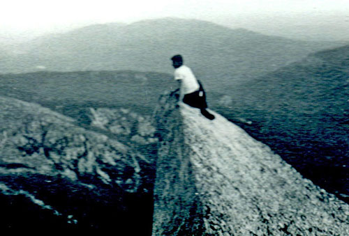 Luckily for us, we deferred The Chimney for our second day in the area. On the first we scrambled up Pamola the peak’s eastern summit, taking time to look heroic on Index Rock (a giant boulder), and then traversed the knife edge to the true summit. That evening, back at Chimney Pond campsite, I looked up at our next day’s challenge. But as I was doing so, a rumor began quietly to circulate, like a ground fog: there had been an accident. In the Chimney. A young woman had been hurt in a fall, how badly was unclear. A vague call for volunteers went out. Don and I immediately started to repeat our day’s hike. By the time we had summited Pamola and dropped down to the top of The Chimney, it was dark and getting cold fast. We were the first to arrive. We had the good sense--or the fear--not to descend by ourselves to the victim. After an hour or more rescuers arrived, nearly 30 of them. Some climbed down and toward dawn emerged with a (live) body in a stretcher. We took turns handing it down the very rocky terrain to Chimney Pond. Don and I slept through much of the day.