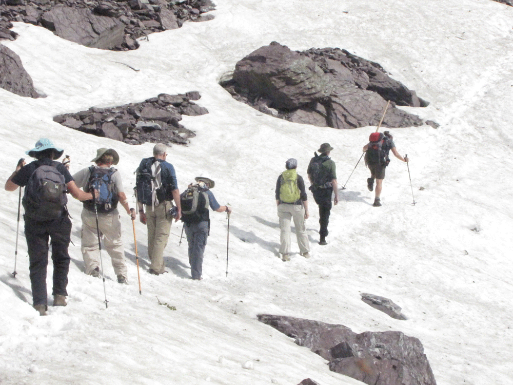 Bears: Jack Olsen’s book, The Night of the Grizzlies, describes two fatal attacks in Glacier one night in 1967. One of these was in the Granite Park campground, only a few hundred yards from the chalet. As I recall, Olsen’s thesis is that people and bears cannot really inhabit the same terrain. The Park Service contends otherwise and tries to make peace between the species. When there is a conflict, it is the bears that are favored; if bears have been active on a trail, the trail is closed until they have gone away. To be sure, they do not always make their presence known. Although usually not aggressive, they dislike surprises. In poor visibility you are therefore advised to repeat “Hello, bear” in a firm but friendly voice. If you do sight one of these creatures, avoid eye contact and back off slowly while making small talk. If despite this the bear comes after you, it is time to ready your pepper spray bear deterrent, which you are carrying on your belt for quick access. Wait till Smoky gets close. Don’t spray into the wind. Do not run away. The bear is much faster than you are.