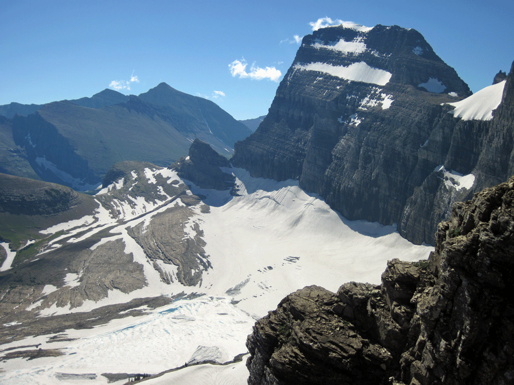 Our big hike started the next morning: zig-zigging across a big canyon to a high saddle. The trail was fairly steep, and intermittently snow-covered. The snow was negotiable in boots; but remembering the previous day’s slip, Jennifer had brought a long-handled shovel to make really big steps. Behind us came a couple with two teenage sons. The mother was wearing running shoes, which were unhelpful on the snow. She kept sensibly resolving to turn back, but the family urged her onwards. After about three hours they--and we--reached the saddle. It gave great views of snow and mountains on the far side. We ventured another half mile for a view of the Sperry Glacier, one of the 25 remain in the park. As recently as 2000 there were 38. In the 19th century, 150. One forecast is that by 2020 they will all be gone.