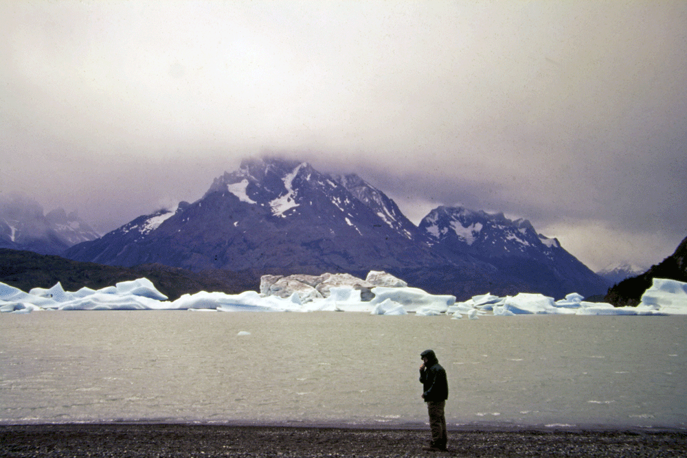 The next day we headed back to Argentina. En route we viewed a large waterfall between two of the lakes and walked by the outlet of Lago Grey. Here we had our first taste of the famously wild Patagonian weather. The lake is not merely glacial but fed directly by a large glacier. This deposits ice hunks that float as bergs toward the outlet. We struggled along the pebbled beach while the wind roared over the bergs, accompanied by rain and snow. A few minutes of this were quite enough. Later we climbed a small view-granting hill, only to be blown sideways and down as we fought our way up the trail.