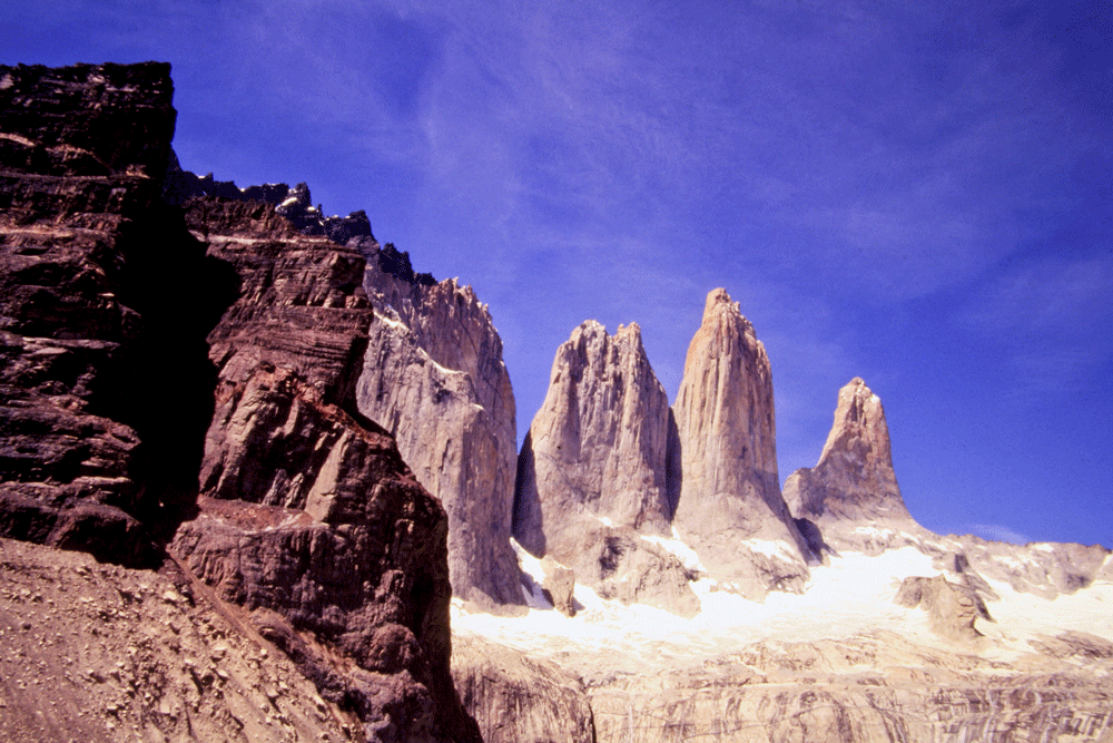 The Towers of Paine are an astonishing sight. Viewed from the glacial tarn a mile away, the three granite peaks soar some 4000 truly vertical feet into the sky. Photographs convey little sense of their immensity. You must go yourselves to see them, so to speak, in the rock.