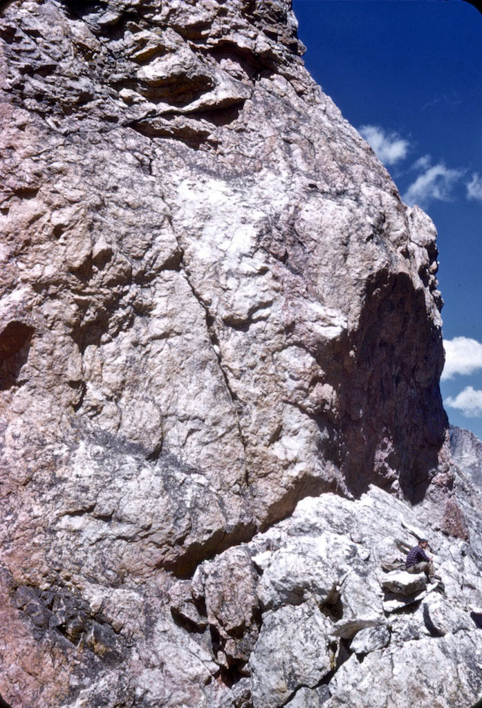 The route, now the easiest of several, starts in a jam crack, then traverses right to a belay. Dick Pownall led this on the first ascent. Then it was Bob’s turn on the sharp edge. In his words: “[the north face] is relentlessly vertical.... There is nothing climbable near our corner position. It looks possible, however, to traverse about ten feet onto the face on tiny ledges.... Now irreversibly committed.... Can’t release a hold for selecting and driving a piton.... Breathing hard, hug the face and look around.... More than forty feet above Dick now.” Finally, to his vast relief, Bob does manage to place a piton. The way to the top remains difficult, but at least he has some protection.