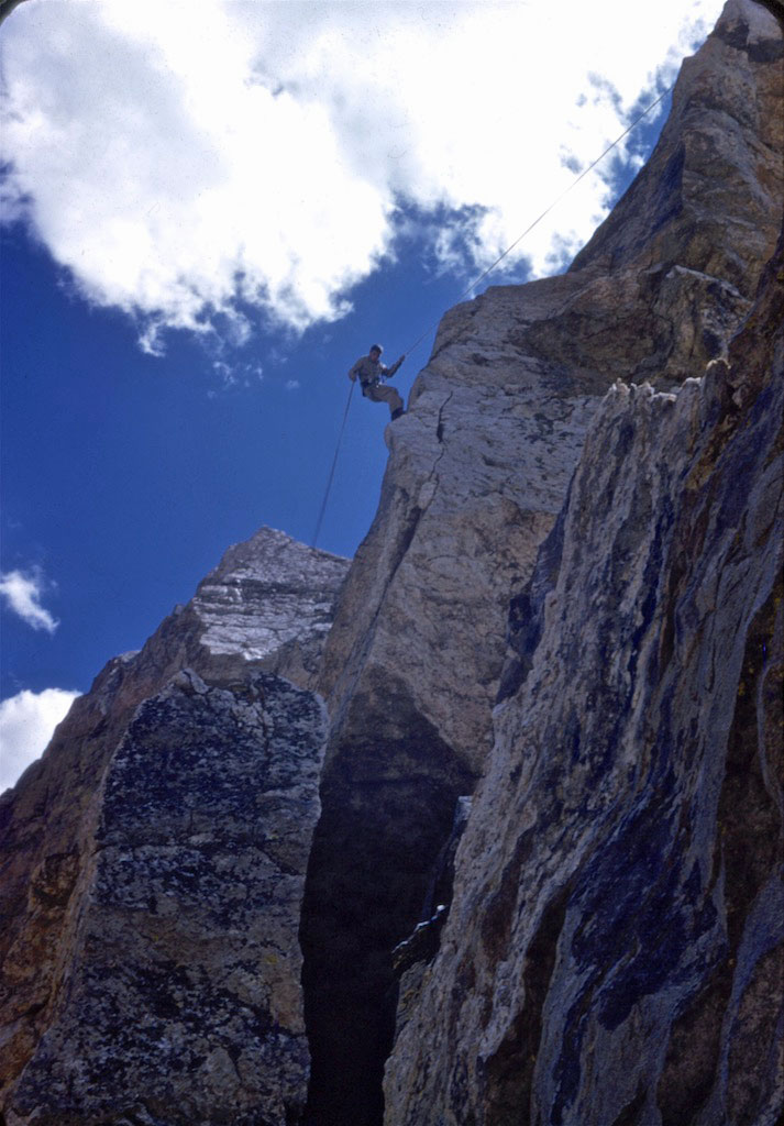 I was 15 years old when Bob Merriam told me about Red Sentinel. “This remarkable, chisel-like pinnacle,” says the guidebook. Despite a number of serious attempts, it had remained one of the last unclimbed spires in the Tetons until two years earlier, 1950. Then Bob and three other Tetons guides reached the top. More than 60 years later, Bob sent me a narrative of the climb that he had written for a publication in North Carolina, where he was living in retirement. I was glad to see that he found it challenging.
