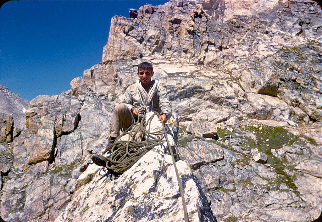 In August 1955 my partner Mike Wortis and I attempted the Sentinel. It had seen almost no ascents since the original, and this was a daring venture for us. I led the first pitch so that Mike could have the harder one, as was common with us. I climbed the jam crack and clipped the piton at its top. Then I took one look at the traverse and went back down. I spent some time working up my determination before I went up again. Rather than embarrass myself with a second retreat, I made my way across the traverse (“delicate,” says the guidebook) and clipped into the belay, at the intersection of the east and north faces. Now it was Mike’s turn. More than 60 years later, he recalls the first intimidating moves onto the north face. He also remembers a “corkscrew hold” farther up. Nothing seemed to slow him down, and he didn’t need speeding up.