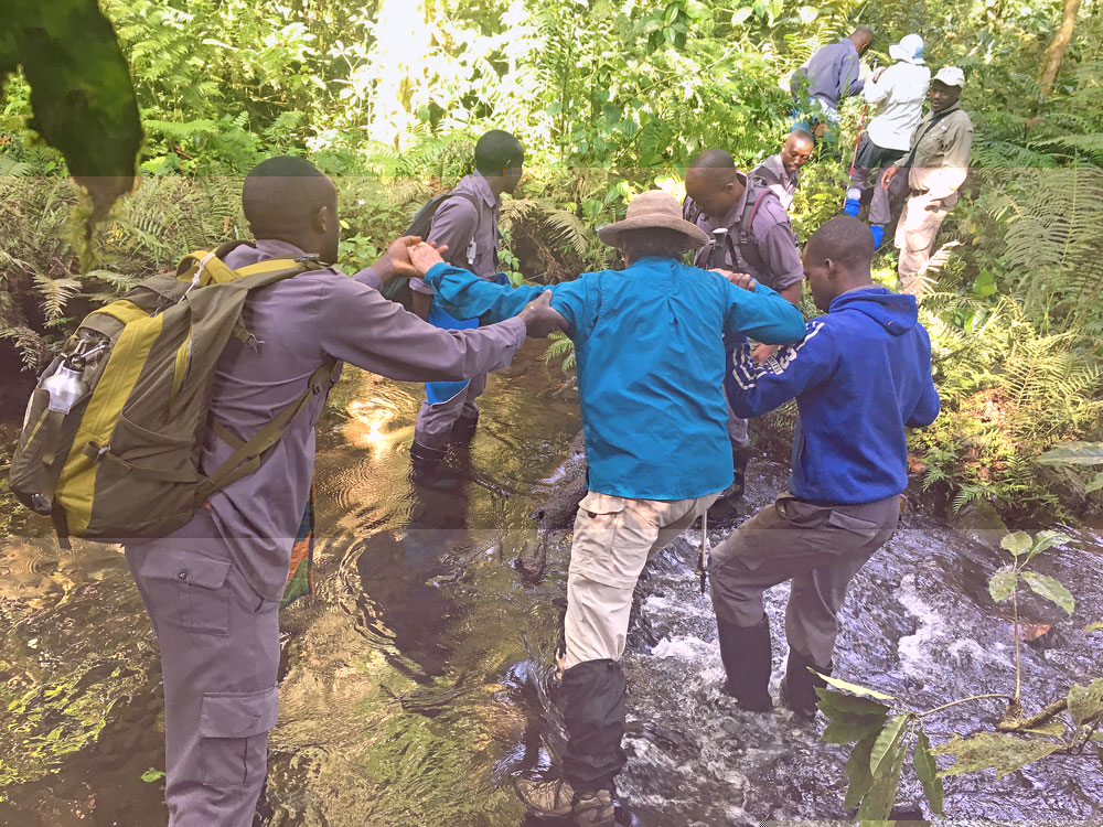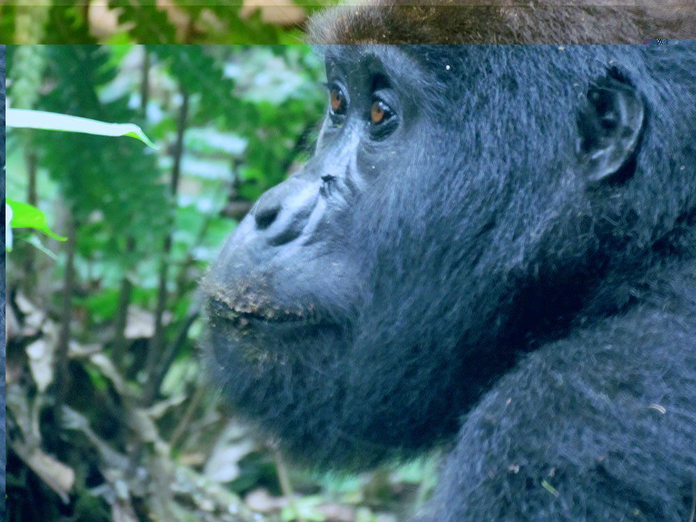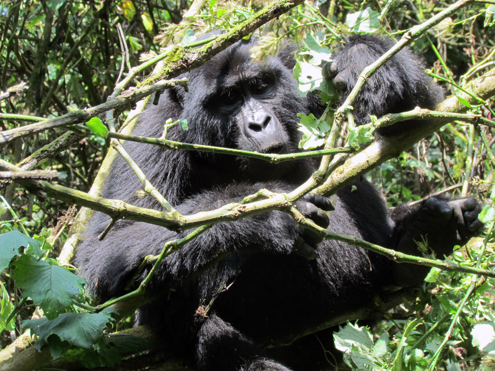 Off we went. There had been little rain, so the rough paths were not muddy, nor were they rocky; they were crossed by tree roots and occasional fallen logs, however, so you did have to watch where you were going. The nastiest part was a couple of short but slippery stream crossings. The gorillas must have been sympathetic to my infirmities: they were away less than an hour and half of nearly level walking. As you near them, the trackers take over the guiding, and you stay very quiet. The gorillas are neither carnivorous nor aggressive, but they can be very intimidating, weighing over 400 pounds. NOTE: the families that you visit have been “habituated” to human presence—a process that takes a couple of years and can be hazardous at first. But once habituated, they pay you no heed. You are supposed to stay 25 feet away from them, but sometimes they approach you (don’t let them snatch your cell phone). A medium-sized one casually crossed the path where we were standing and wandered oblivious to the other side. Their main morning occupation is eating leaves, on the ground and in trees. Unwise to stand beneath one of them, lest you become a toilet.