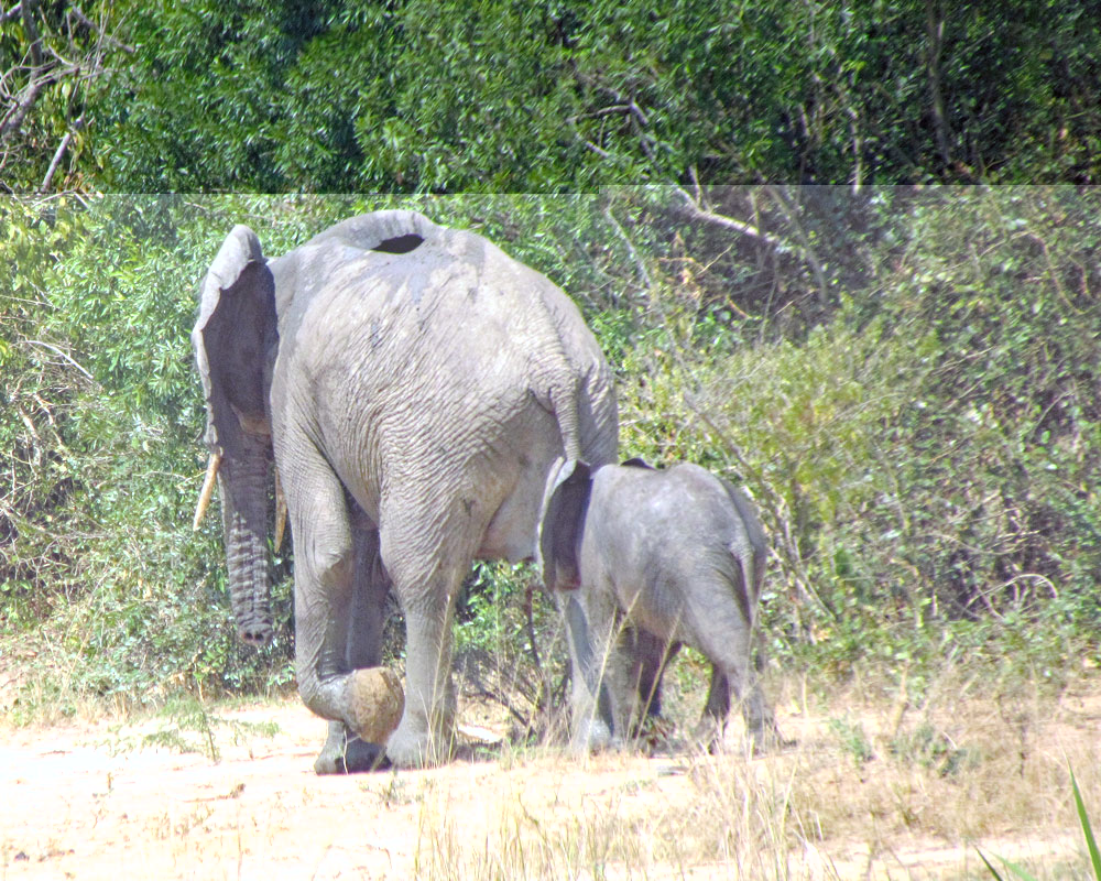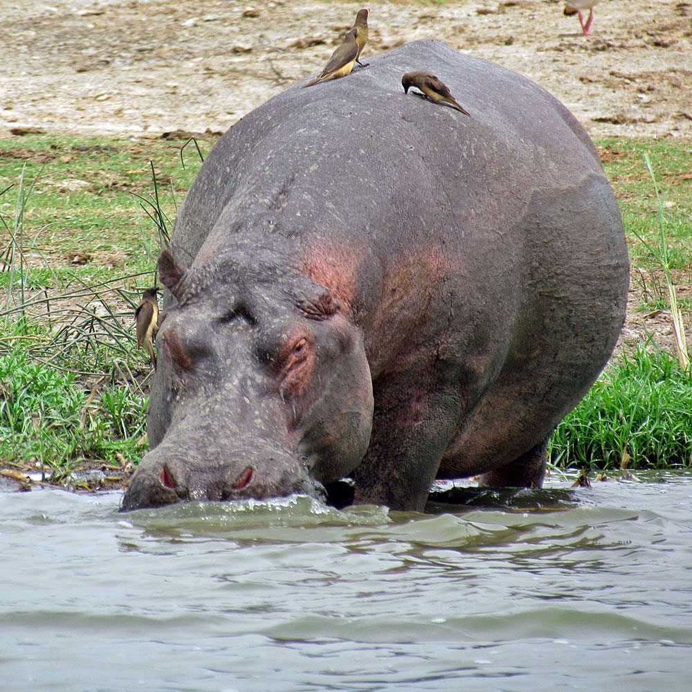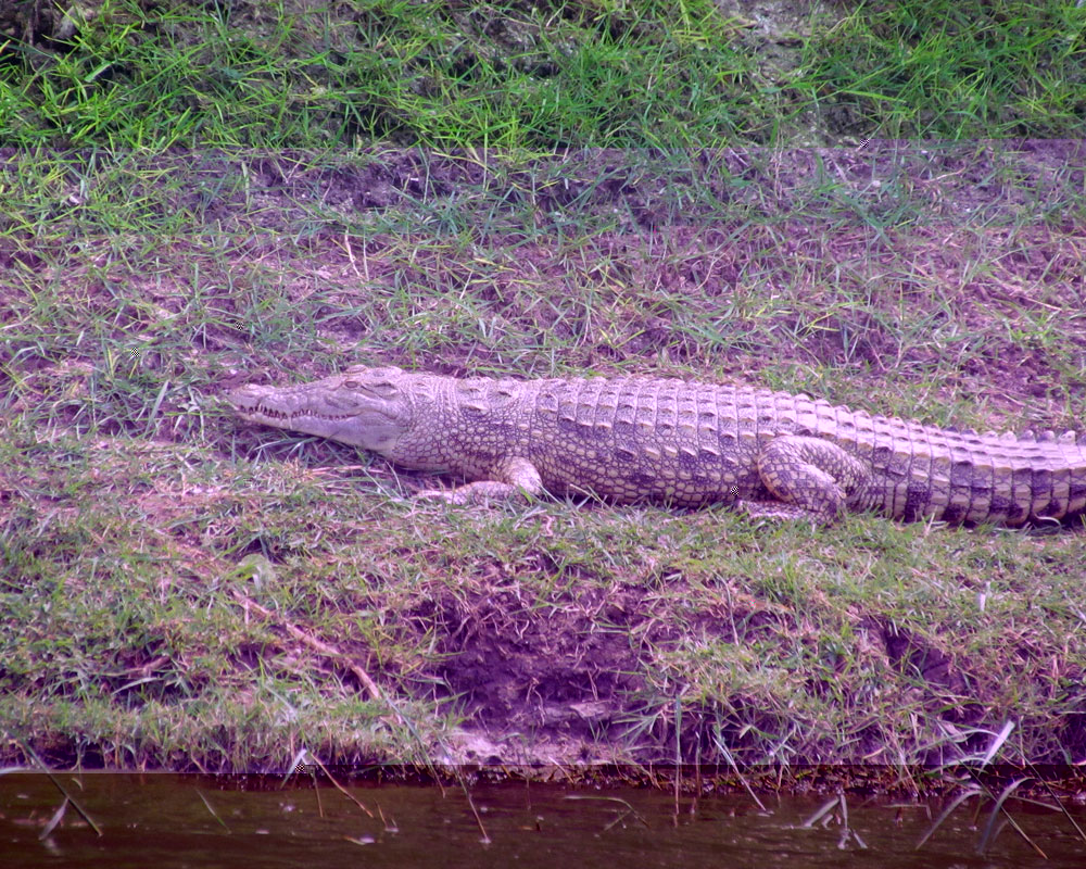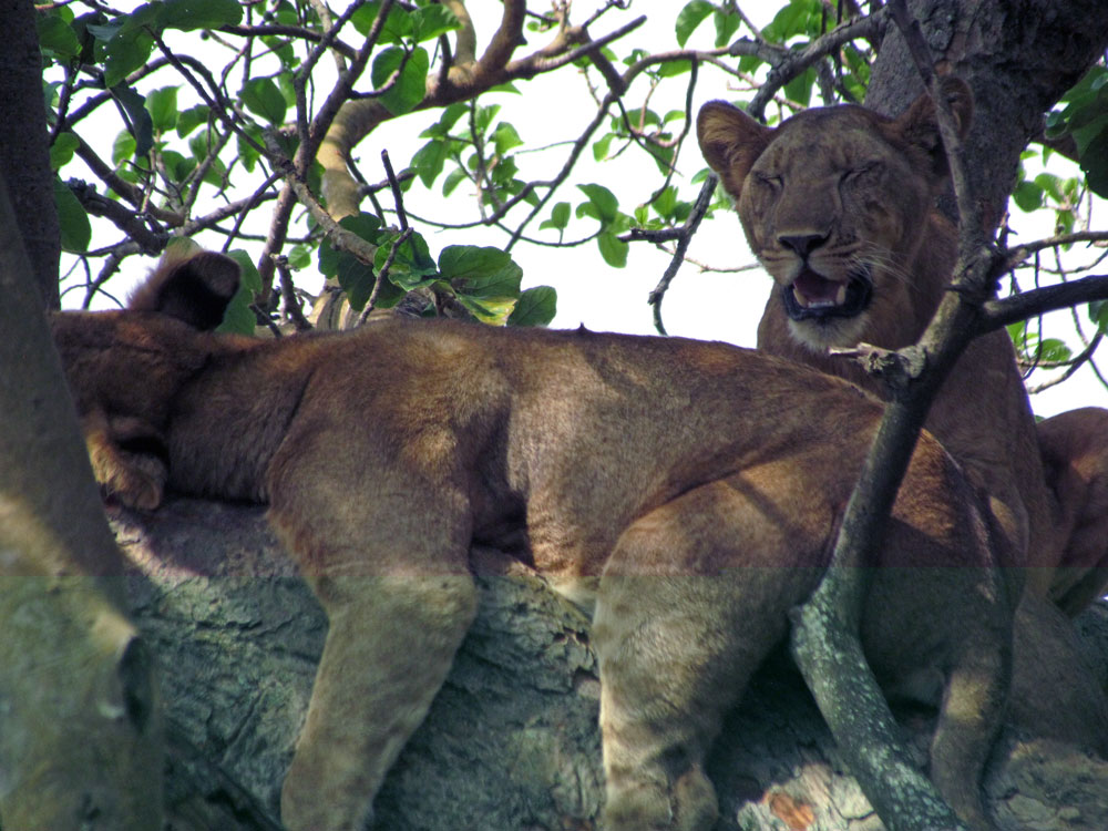 On to Queen Elizabeth National Park. Here we took our best boat trip, on the Kazinga Channel between Lake Edward and Lake George. Elephants, profuse, walked majestically along the far bank and cooled of in the water. Hippos were abundant, although usually only their backs were visible, like rubber tarpaulins. We saw one on shore, walking by a bunch of people who ignored it, as it did them. This despite the hippo reputation for being very dangerous on land. An occasional crocodile slept on the river bank.