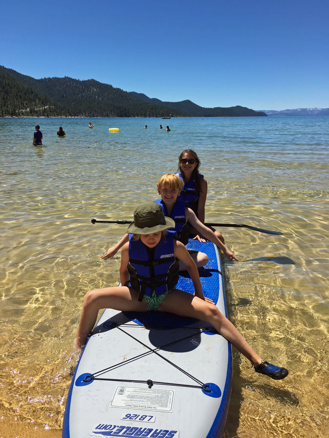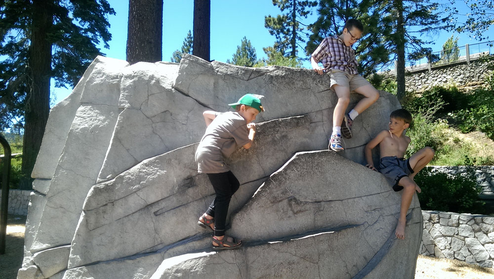 Daily excursions began by car, to beautiful Lake Tahoe and its beaches twice. Another day we hiked to much smaller but also beautiful Lake Flora. Afternoons the kids played around back at the Lodge. On the last evening came a talent show, with granddaughters playing the piano. Zach wrote a skit for himself as a hiker and Susan and me as a menacing wolf and bear.