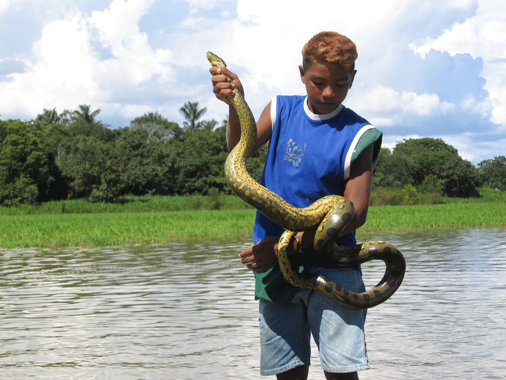 Manaus has a lively waterfront and restaurants where food is sold by weight. But it was time for us to board a boat for the Amazonian retreat that Susan had selected. It was, as promised, some distance from the city, but that distance was only the considerable breadth of the river. So the municipal lights rather modified the sense of wilderness. Nevertheless we found the Juma Lodge a lovely location. Our wood cabin projected over a small pond. The whole place was alive with birds and animals, including Chikira, a predatory pet monkey (watch your breakfast plate). We became part of the small group with whom we had crossed the river: a young Dutch couple, prospering in their financial occupations; and an American family: grandparents, footloose daughter (living in Bali) and her 10-year-old son Siddhartha Josh, mercifully known as Sy. We collectively boated to a native village and had a short jungle walk.