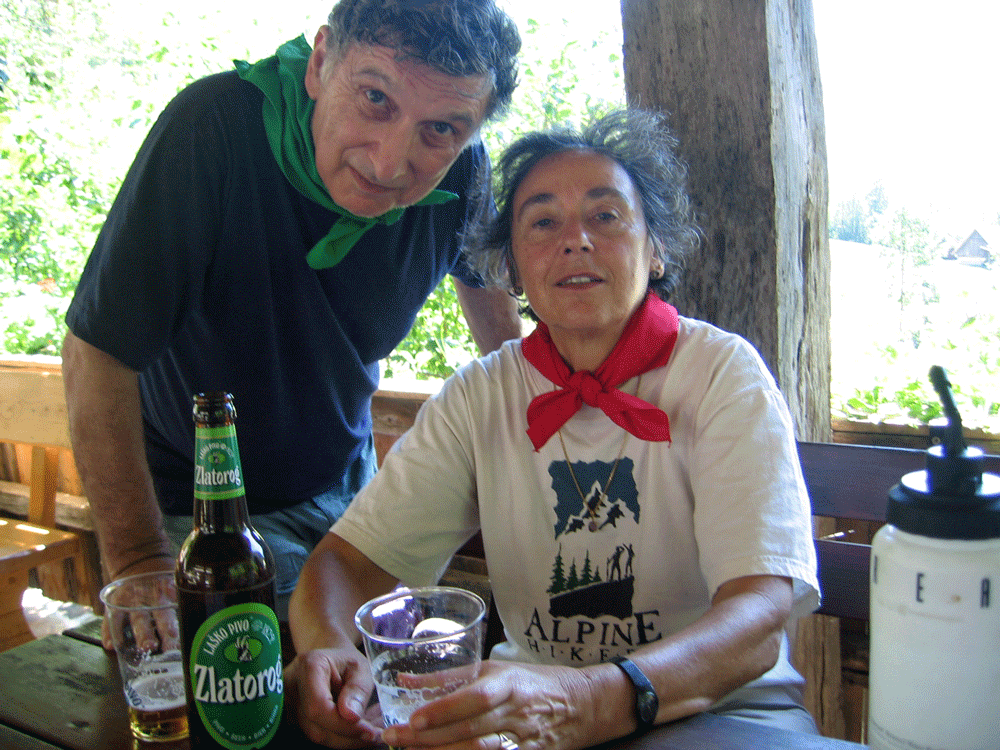 Our four fellow client hikers had various limitations: one was great going up but terrified of descent; another was bad at both, though fine on level ground; a third was breaking in new boots, while the other was even older than I. The trip had happily been planned with a number of options, so that participants could avoid the longer or steeper trails. On the first day, only Susan and I, with Nena and Ivona, chose an afternoon ascent past an enormous waterfall. An hour later we reached a hut with beer and tourists from Spokane. “We take easier way down,” Nena announced. It might have been easier had it not been swept away by an avalanche of last winter’s heavy snow. As it was, we had to scramble up a mangled slope and across scree to regain what remained of the trail. We had a similar problem the next morning: the route vanished in a tangle of downed trees. We retreated to a hut for mushroom soup (a national favorite) and blueberry liqueur.