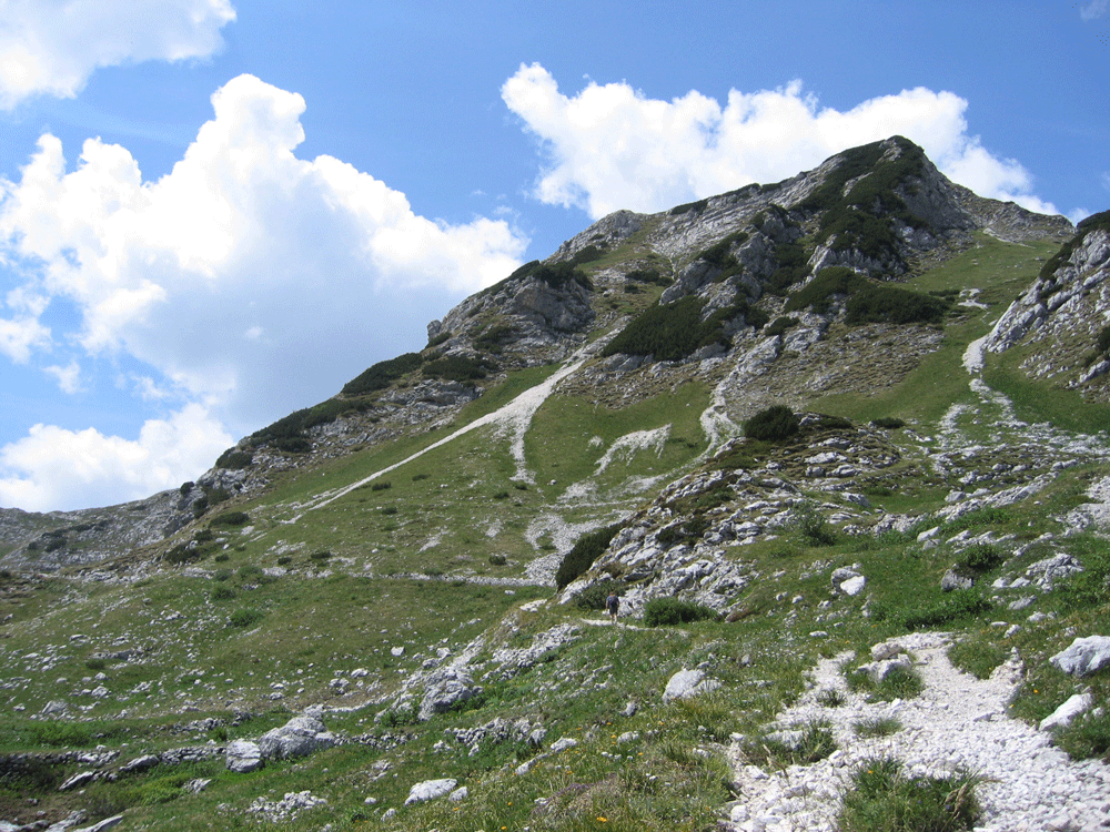 We drove on to another (islandless) lake, Bohinj. We stayed at the Hotel Jezero, near the waterfront of a small resort town. Hikes from here were relatively gentle, and ended with a swim in the lake. We were now in Triglav National Park, home of the Julian Alps. The highest point is Triglav, 9,394 feet. It is said that every Slovenian must climb it at least once, but we weren’t Slovenian and didn’t have to. Our most ambitious venture was a moderate but long hike to a Swiss-style hut high in the mountains. En route we saw abandoned stone houses, as well as works remaining from the fierce fighting in WWI. We were in the Kobarid region, known to all of you as Caporetto, scene of the chaotic Italian retreat in A Farewell to Arms. The hut itself was very comfortable; we had a private room with a bathroom (flush toilet) down the hall.
