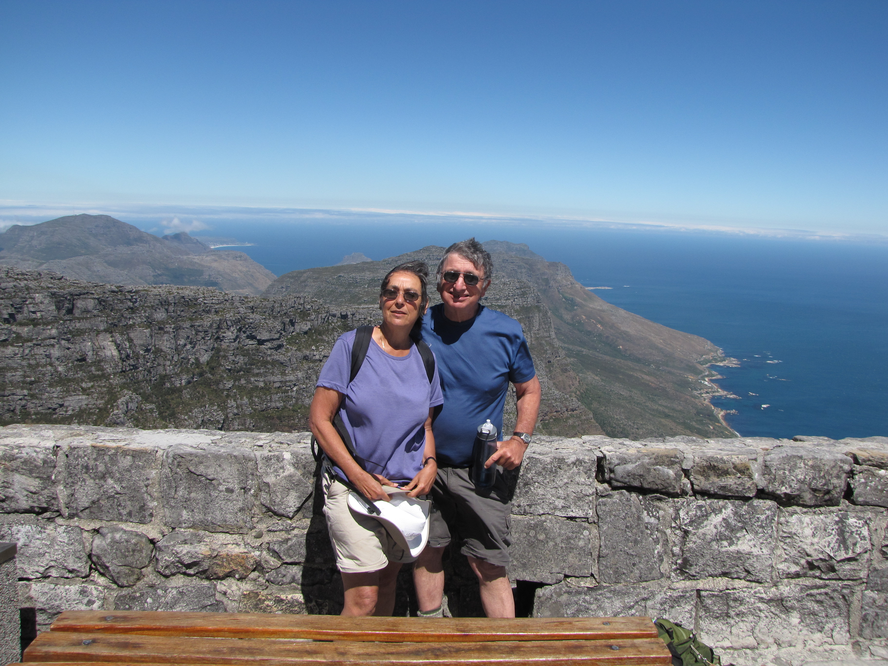 The next day it was time for Table Mountain. We hired a guide, Randall, to show us the way. Platteklip Gorge ("Flat Stone Gorge"), is said to provide “an easy and direct ascent to the summit.” It is the route taken by Antonio de Saldanha on the first recorded ascent of the mountain in 1503. It may have been direct and easy for him... Randall drove us close to the trailhead. There we found an American who had spent an hour looking for the start of the route. It was time I met someone I knew: Phil Erard, from the American Alpine Club. I was glad to see him, because he is about my age and therefore slow. The four of us started up the trail. Phil asked Randall for his fastest time to the top. This was a bad sign. Phil took off like a rocket, and we never saw him again. Our plodding rate was fast enough for me. It’s just a trail, but it steepens, with many switchbacks. By the time we reached the summit plateau, clouds had started to move in. The weather can be deceptively dangerous--it is like Mount Washington in that way. Randall warned the numerous other hikers that they should not linger. The cable car system, which can zip you down to the city in a few minutes, had been suspended because of the high wind. So we spent little time admiring the stupendous view in all directions. On the way down (hard on thighs and knees), we encountered a young law student from Chicago, who had was lagging behind her group. This was her first hike ever, and she was not ready for it. She was dehydrated and very tired indeed. Randall helped get her down.